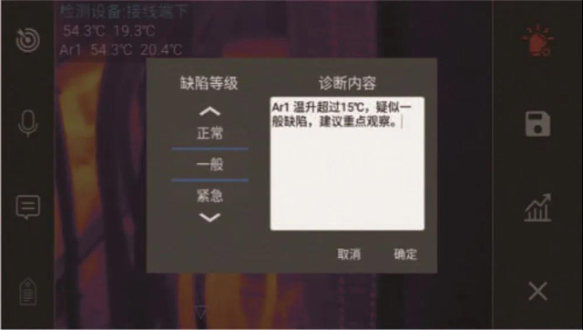 現場(chang)檢測時可直接調(diào)用診斷規範,智能(neng)診斷設備當前狀(zhuàng)态,給出“正常、一般(ban)缺陷、嚴重缺陷、緊(jǐn)急缺陷”等診斷結(jie)論,根據診斷結論(lun)自動給予方案建(jian)議,并将診斷結論(lun)和解決方案保存(cun)于當次檢測任務(wu)内。