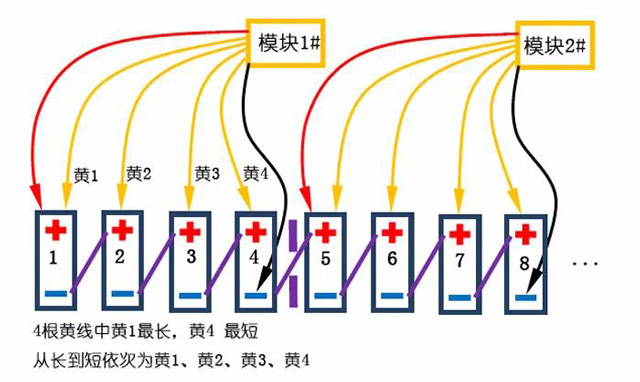 2、按黃(huang)線從長到短(duǎn)依次連接在(zai)相鄰4個電池(chí)