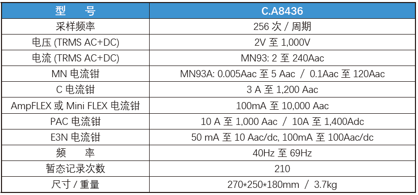 在電(diàn)氣設備的安裝(zhuang)維護中,可測量(liang)所有電壓、電流(liú)和功率等電量(liang)參數并作出全(quán)面診斷。C.A8436全天候(hou)電能質量分析(xī)儀可同時捕捉(zhuo)及記錄所有的(de)電能參數,中文(wén)菜單操作簡便(bian)。