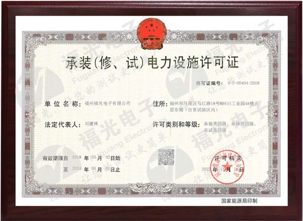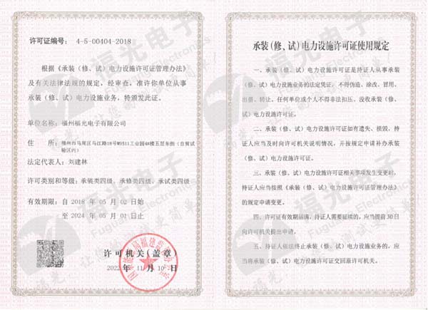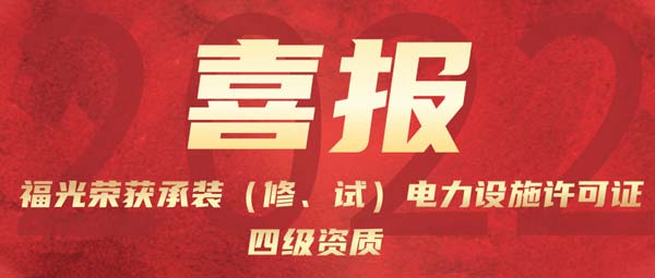 行業(yè)權威丨福光電(dian)子榮獲承裝(修(xiu)、試)電力設施許(xu)可證四級資質(zhì)