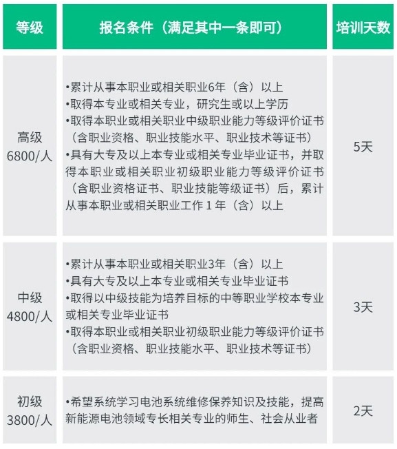 “電池維修(xiu)保養”(初、中、高級(ji))職業技術證書(shu),爲新能源