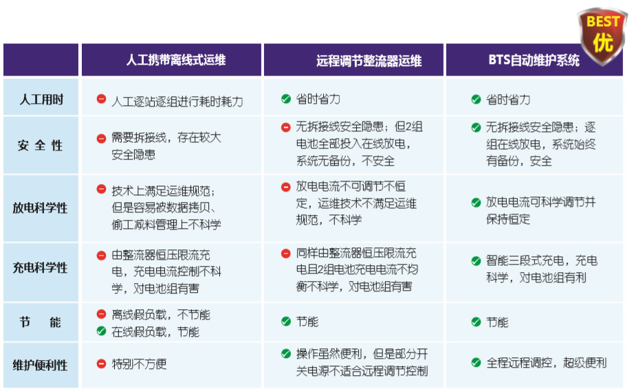 結論:BTS系統從(cong)人身安全、放電科(ke)學性、節能環保、維(wei)護🔴便利🤞性等方♊面(mian)各項指标均優于(yú)傳統維護技術