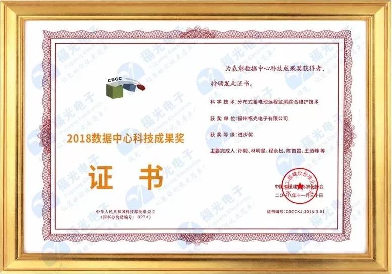 2025年12月(yue)4日至30日,由(yóu)中國工程(cheng)建設标準(zhǔn)化協會信(xìn)息通⁉️信專(zhuan)業委員會(huì)數據中心(xin)工作組(CDCC)主(zhu)辦的“2018數據(jù)中心年度(du)峰會✨”在京(jīng)召開。期間(jian),“2018 數據中心(xin)科技成果(guǒ)獎” 評選活(huo)動獎項揭(jiē)曉, 福州福(fú)光電子有(yǒu)限公司選(xuan)送“分布式(shì)蓄電池遠(yuǎn)程監測綜(zōng)合維護技(jì)術”,在評選(xuan)活動中脫(tuō)穎而出,斬(zhǎn)獲“科技進(jìn)步獎。