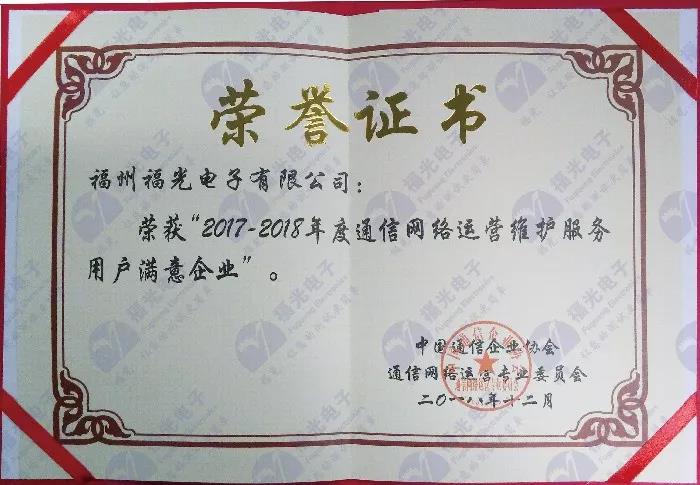 12月20-21日(rì),福州福光電子(zǐ)有限公司受邀(yao)參加由中國通(tong)信企業協會指(zhi)導,中國通信企(qǐ)業協會通信網(wang)絡運營專業委(wěi)員會主辦的2018年(nián)中國通信網絡(luò)運營維護服務(wu)年會,會議同期(qi)榮獲 “2017-2018年度通信(xin)網絡運營維護(hù)服務用戶滿意(yi)企業”稱号,連續(xu)多年獲得中國(guo)通信企業協會(huì)授予的“用戶💔滿(man)意企業”殊榮。