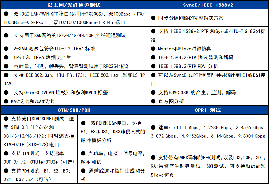 TX300S是(shi)一款便攜式(shì)OTN/SDH/SONET/PDH/DSn以太網和同(tóng)步分組網絡(luò)測試儀,全面(mian)滿足傳統功(gōng)能測試的同(tóng)時,還可以支(zhi)持基于移動(dong)回程技術的(de)SyncE,1588PTPv2,電信級以太(tài)網和CPRI測試功(gōng)能。