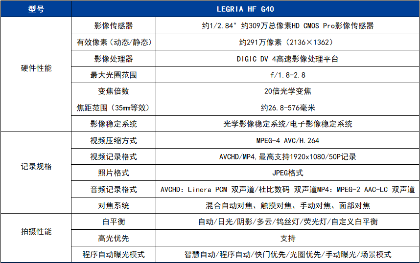 LEGRIA HF G40 采用了(le)與專業(ye)級攝像(xiang)機相同(tóng)的攝像(xiàng)鏡頭、影(yǐng)像傳感(gan)🈲器、影像(xiang)處理器(qi)三大主(zhu)要成像(xiàng)元件;并(bìng)搭載了(le)源自專(zhuān)業攝像(xiàng)機的伽(gā)馬曲線(xian)設置,讓(ràng)用戶能(neng)體驗到(dao)專業級(ji)産品的(de)高畫質(zhì)。