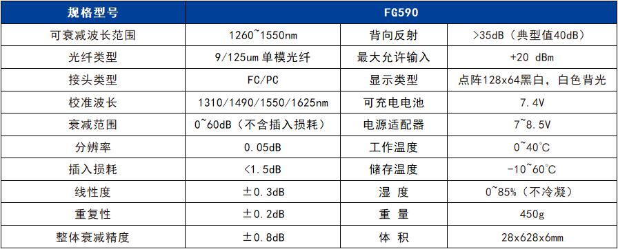 FG590手持式可調(diao)光衰減器是(shi)爲安裝、運營(yíng)和維護光纖(xiān)網絡⭐專🤟門設(she)計的一種精(jīng)準、耐用的便(biàn)攜式儀表。具(ju)有小巧的外(wài)形、可選擇開(kāi)關的背光顯(xian)示功能、超寬(kuan)的光衰減範(fan)圍、精準的衰(shuāi)減精度以及(jí)用戶自校準(zhun)🌍功能和通用(yong)接口設計,同(tóng)時衰減值通(tōng)過液晶屏顯(xian)示。